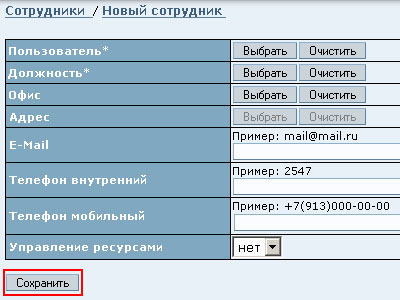 Пользователь. Пользователь, который будет зарегистрирован как сотрудник в организации. Обязательное для заполнения поле.