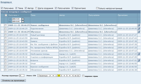 Путь: ► [Меню] / «Сообщения» / «Входящие» Пользователь имеет возможность отмечать новые Сообщения прочитанными. Для этого необходимо установить флажки напротив новых Сообщений и нажать кнопку "Отметить как прочитанные", после чего Сообщения помечаются прочитанными и в столбце "Прочитано" проставляется дата и время прочтения. ![]() | |