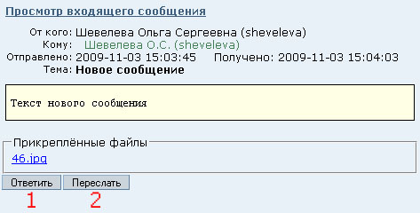 Для того, чтобы ответить на входящее Сообщение, нужно войти в режим просмотра этого Сообщения и нажать кнопку "Ответить". После этого откроется форма для редактирования Сообщения, в которой автоматически будут занесены данные о Получателе, а также тема ( в формате "Re: Тема" ) и текст исходного Сообщения в виде цитаты. ![]() Действия: